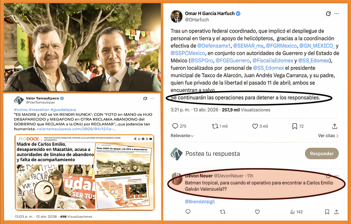 - “Batman tropical, ¿para cuándo el operativo para encontrar a Carlos Emilio Galván Valenzuela?” es un recordatorio de clase: el Estado despliega medio Ejército cuando el desaparecido es alcalde morenista y su padre funcionario; cuando se trata de un joven sin cargo, la respuesta es burocrática, lenta y llena de silencio.